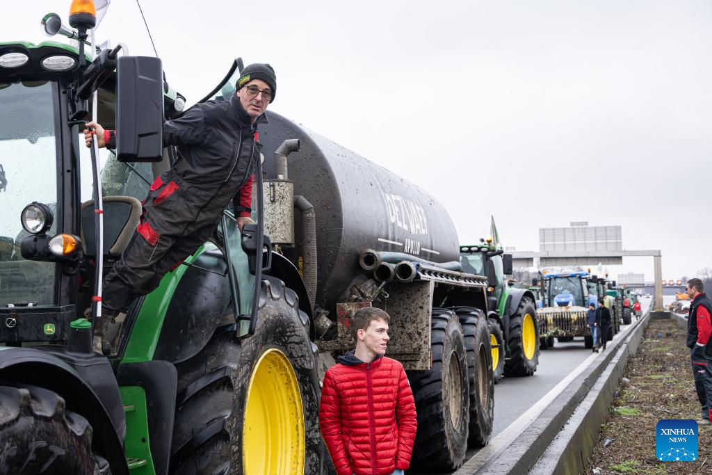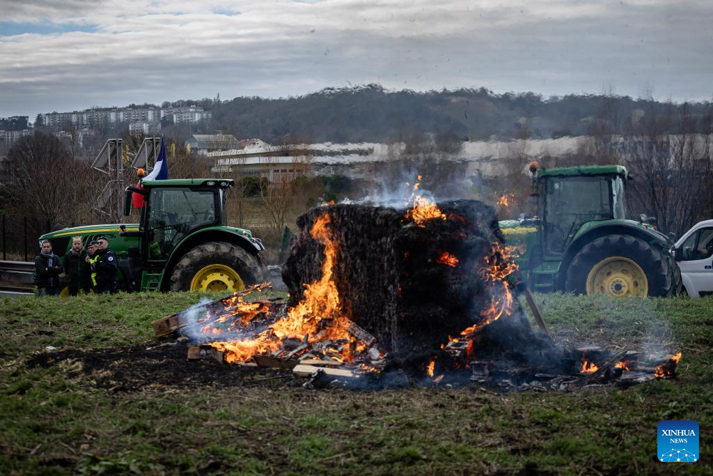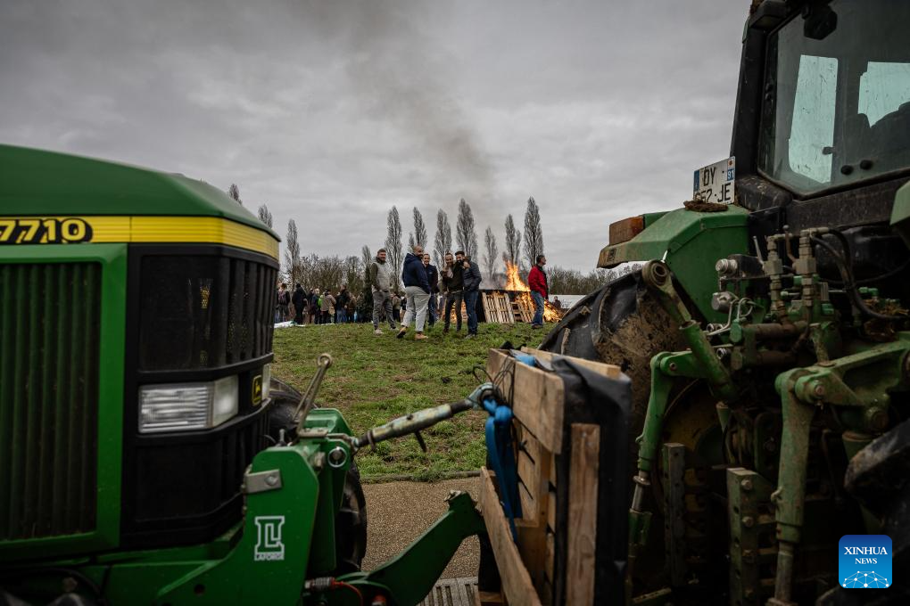 Farmers obstruct vehicle traffic during a demonstration on a traffic circle near Etampes, south of Paris, France, Jan. 25, 2024. French farmers have been staging demonstrations across the country to protest low wages and what they see as excessive regulation, rising costs and other problems. (Photo by Aurelien Morissard/Xinhua)