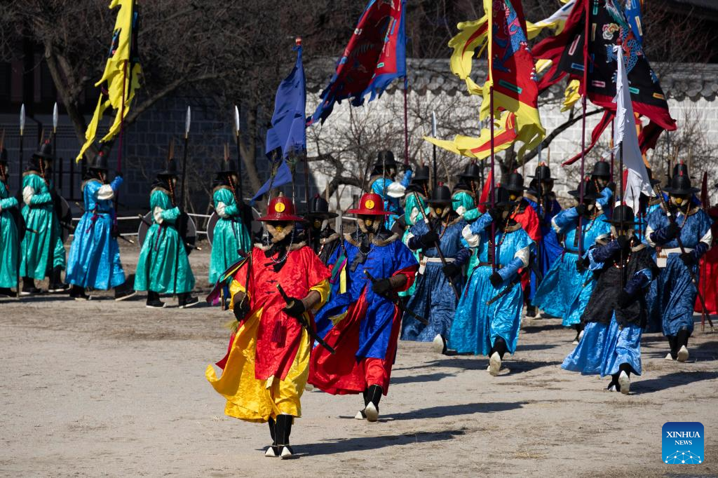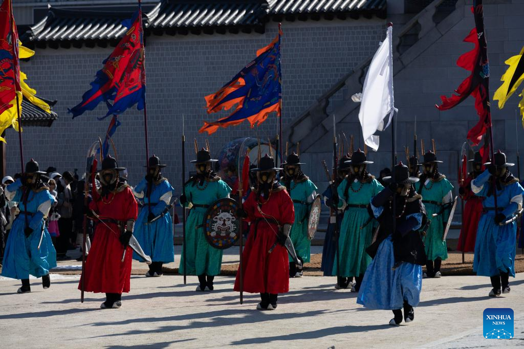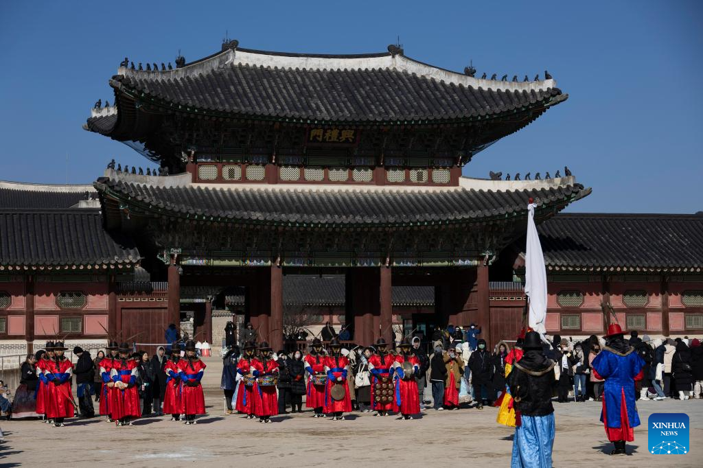 This photo taken on Jan. 24, 2024 shows a scene during a reenactment of the royal guards changing ceremony at Gyeongbokgung Palace in Seoul, South Korea. (Photo by Paul Jones/Xinhua)