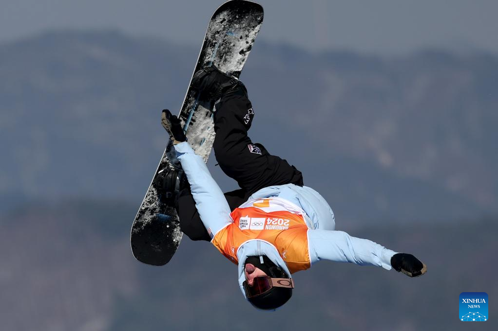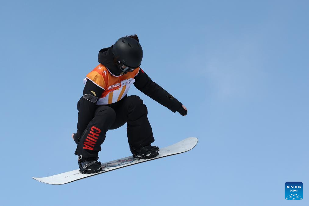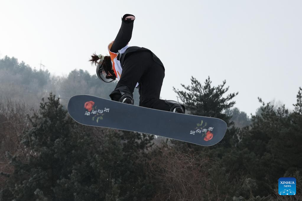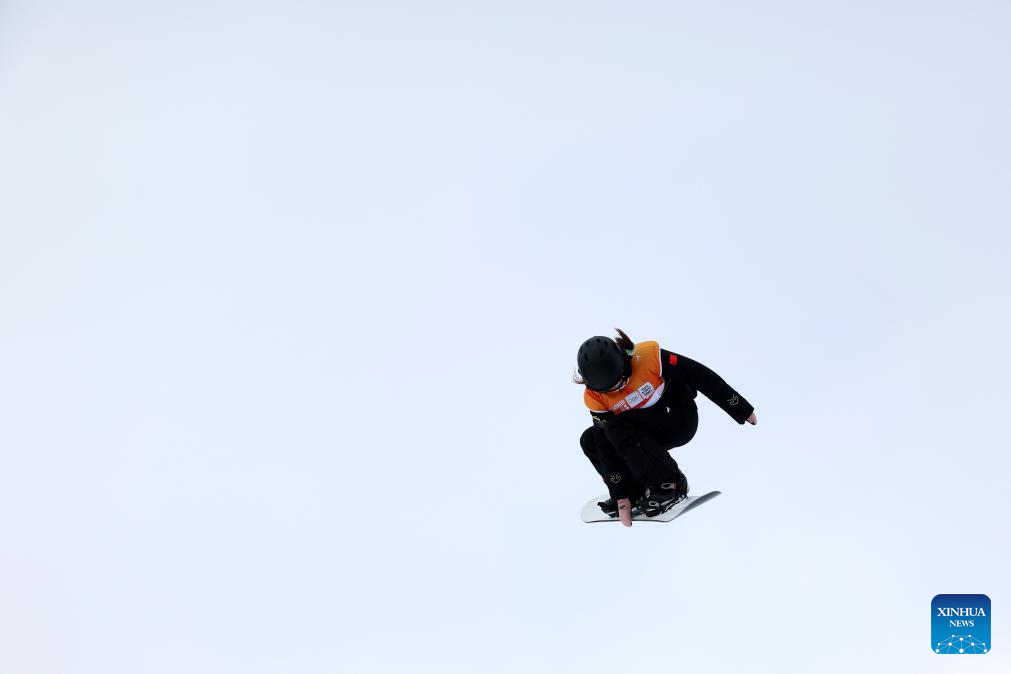 Zhang Xiaonan of China competes during the Women's Big Air qualification of snowboard event at the Gangwon 2024 Winter Youth Olympic Games in Hoengseong, South Korea, Jan. 27, 2024. (Xinhua/Li Ming)
