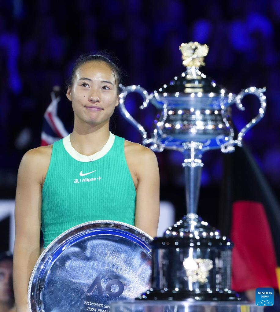 Zheng Qinwen of China reacts during the awarding ceremony for the women's singles final at Australian Open tennis tournament in Melbourne, Australia, Jan. 27, 2024. (Xinhua/Wang Shen)