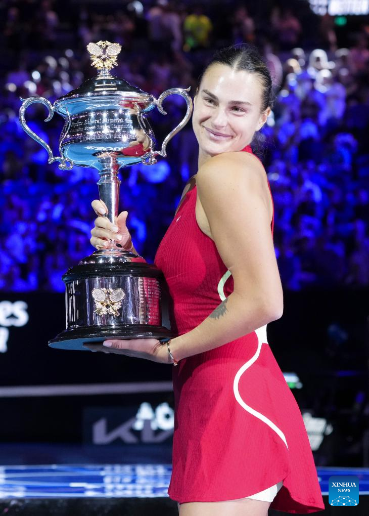 Aryna Sabalenka of Belarus poses with her champion trophy during the awarding ceremony for the women's singles final at Australian Open tennis tournament in Melbourne, Australia, Jan. 27, 2024. (Xinhua/Wang Shen)