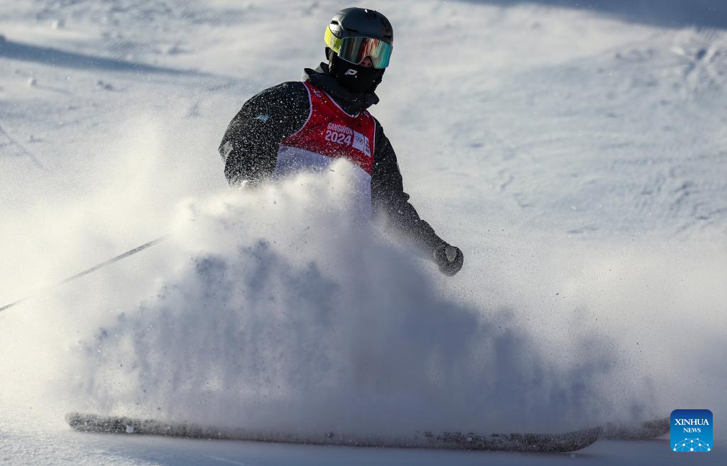 Tazio Buzzi of Switzerland competes during the Men's Dual Moguls of Freestyle Skiing event at the Gangwon 2024 Winter Youth Olympic Games in Jeongseon, South Korea, Jan. 27, 2024. (Xinhua/Hu Huhu)