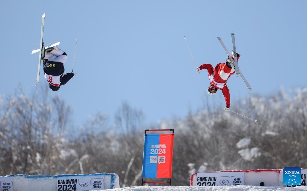 Nakamura Takuto (L) of Japan and Thomas Dooley of Ireland compete during the Men's Dual Moguls of Freestyle Skiing event at the Gangwon 2024 Winter Youth Olympic Games in Jeongseon, South Korea, Jan. 27, 2024. (Xinhua/Hu Huhu)