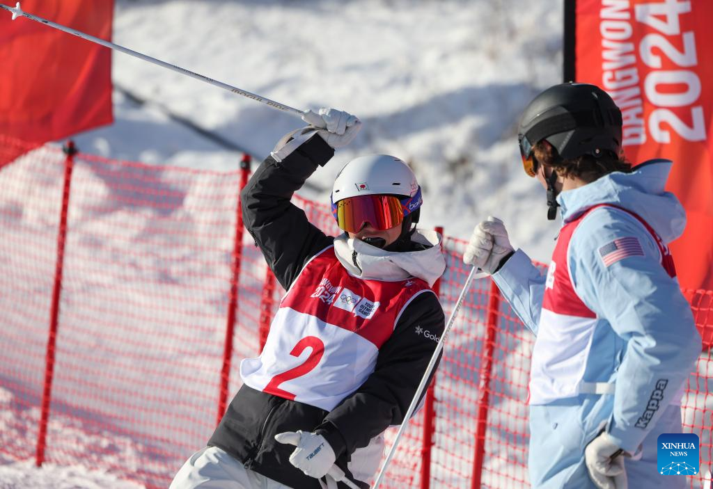 Nakamura Takuto (L) of Japan celebrates during the Men's Dual Moguls of Freestyle Skiing event at the Gangwon 2024 Winter Youth Olympic Games in Jeongseon, South Korea, Jan. 27, 2024. (Xinhua/Hu Huhu)