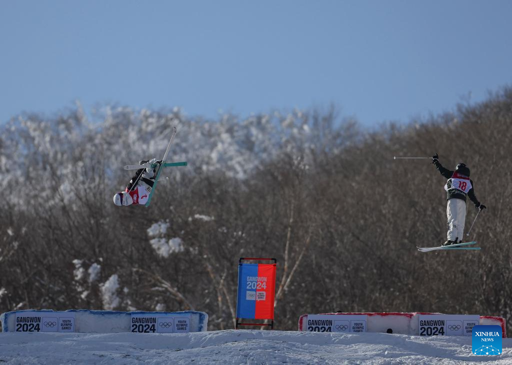 Long Hao (R) of China competes during the Men's Dual Moguls of Freestyle Skiing event at the Gangwon 2024 Winter Youth Olympic Games in Jeongseon, South Korea, Jan. 27, 2024. (Xinhua/Hu Huhu)