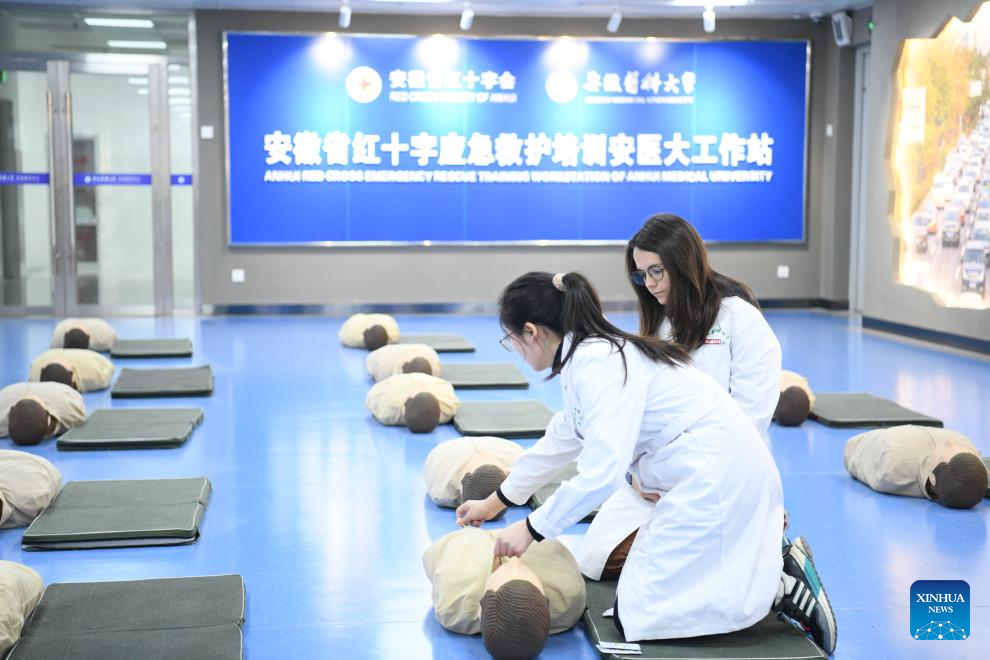 Deborah Bret (back) learns cardiopulmonary resuscitation (CPR) technique at Anhui Medical University, Hefei City, east China's Anhui Province, Jan. 23, 2024. Deborah Bret, a 21-year-old student from Lyon, France, majors in clinical medicine at Anhui Medical University.