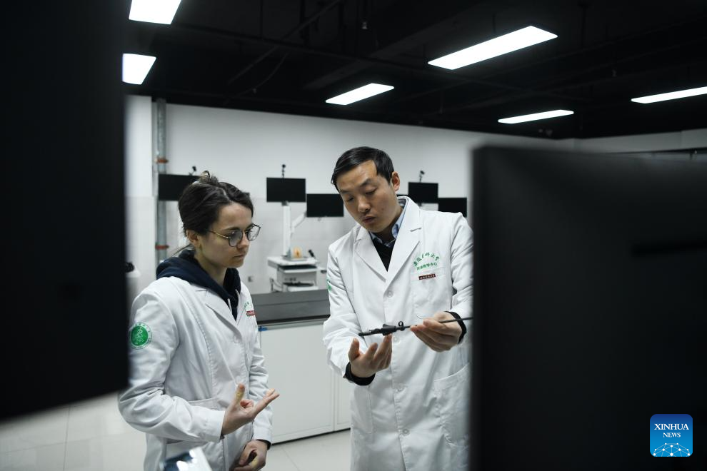 Deborah Bret (L) receives basic training of laparoscopic operation at Anhui Medical University, Hefei City, east China's Anhui Province, Jan. 23, 2024. Deborah Bret, a 21-year-old student from Lyon, France, majors in clinical medicine at Anhui Medical University.