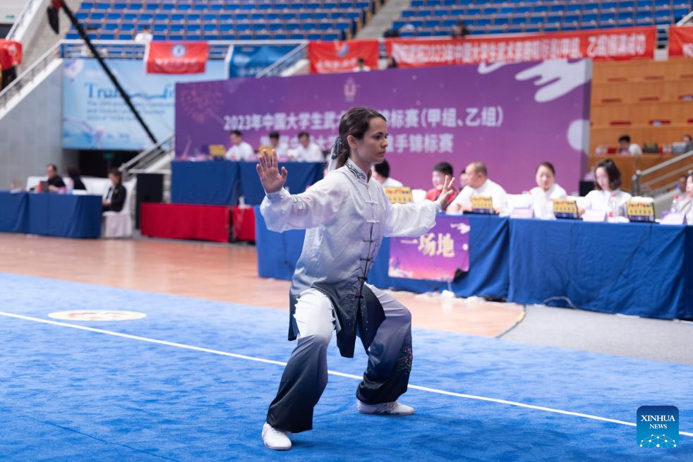 Deborah Bret competes during a national Wushu competition for college students in north China's Tianjin, Oct. 8, 2023. Deborah Bret, a 21-year-old student from Lyon, France, majors in clinical medicine at Anhui Medical University.