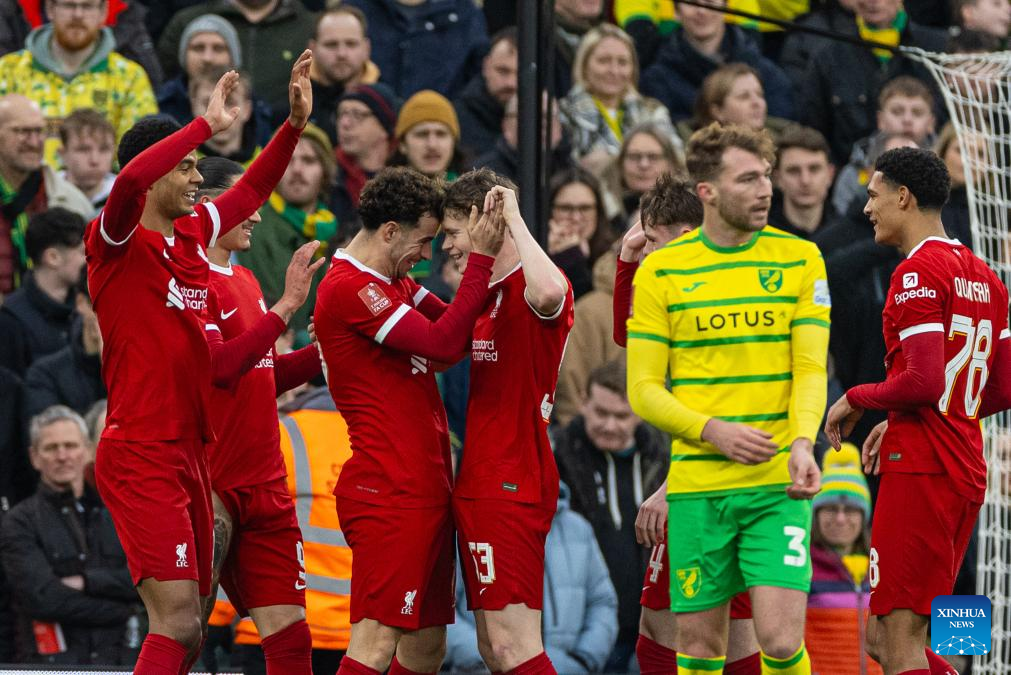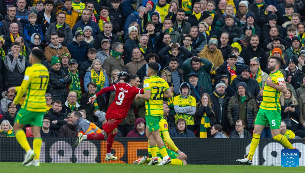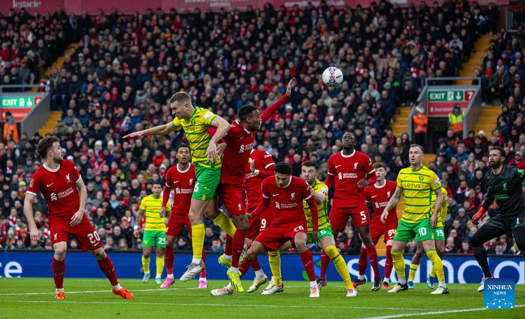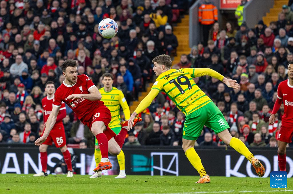 Liverpool's Diogo Jota (L, front) heads towards goal during the FA Cup 4th Round football match between Liverpool FC and Norwich City FC in Liverpool, Britain, Jan. 28, 2024. (Xinhua)