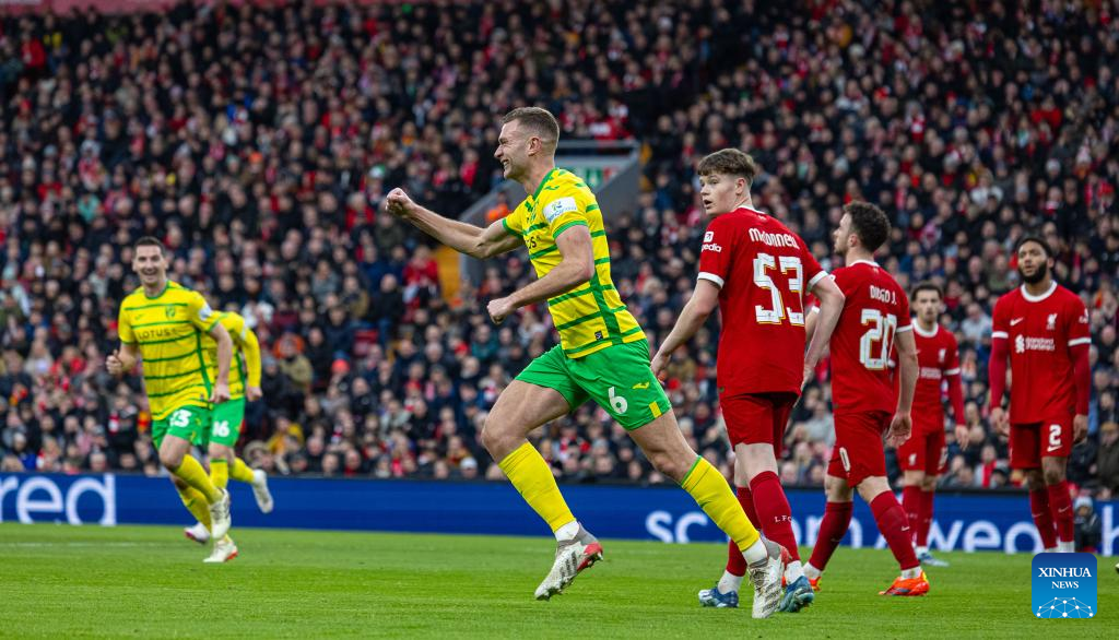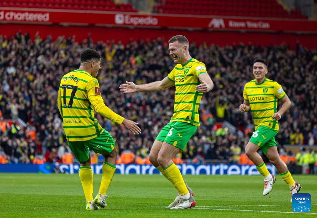 Norwich City's Ben Gibson (front) celebrates after scoring a goal during the FA Cup 4th Round football match between Liverpool FC and Norwich City FC in Liverpool, Britain, Jan. 28, 2024. (Xinhua)
