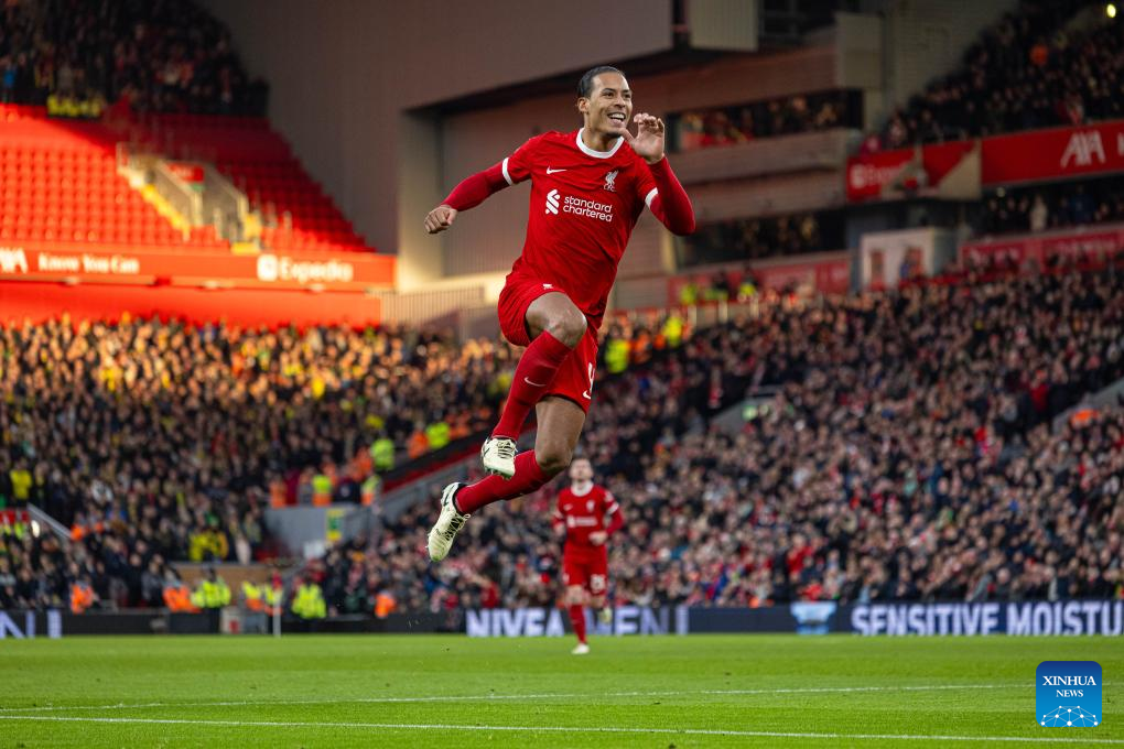 Liverpool's captain Virgil Van Dijk (L) celebrates after scoring during the FA Cup 4th Round football match between Liverpool FC and Norwich City FC in Liverpool, Britain, Jan. 28, 2024. (Xinhua)