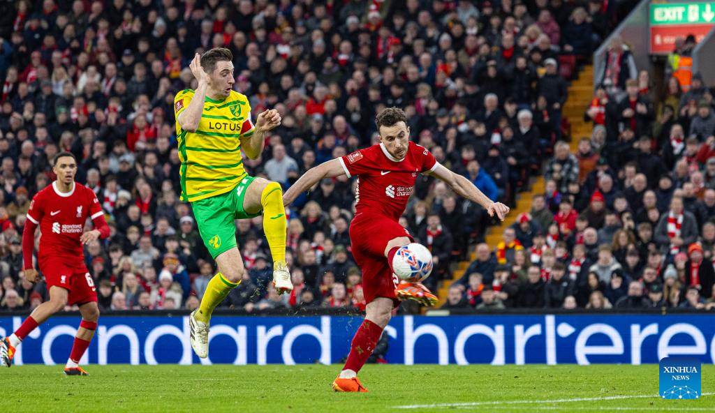 Liverpool's Diogo Jota (R) shoots at goal during the FA Cup 4th Round football match between Liverpool FC and Norwich City FC in Liverpool, Britain, Jan. 28, 2024. (Xinhua)