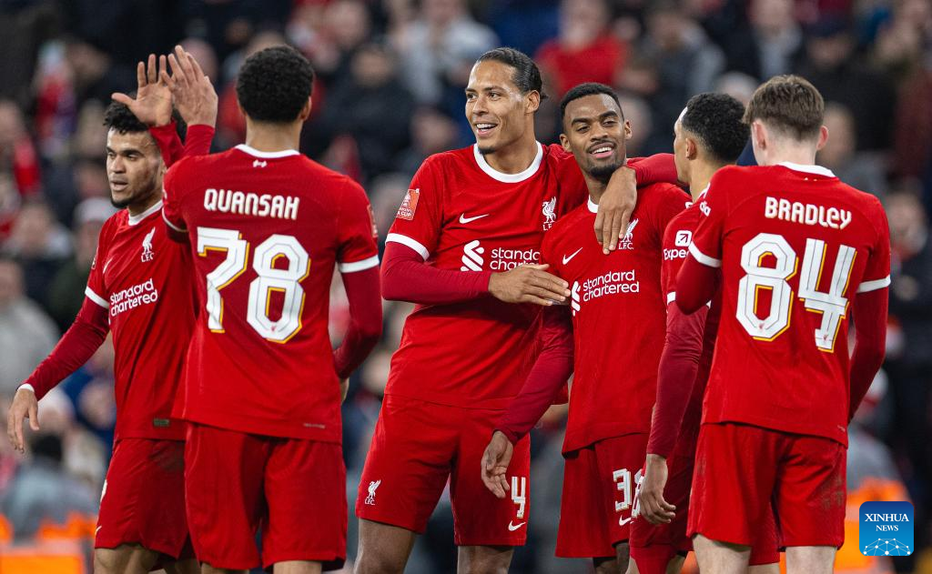 Liverpool's Ryan Gravenberch (3rd R) celebrates after scoring during the FA Cup 4th Round football match between Liverpool FC and Norwich City FC in Liverpool, Britain, Jan. 28, 2024. (Xinhua)
