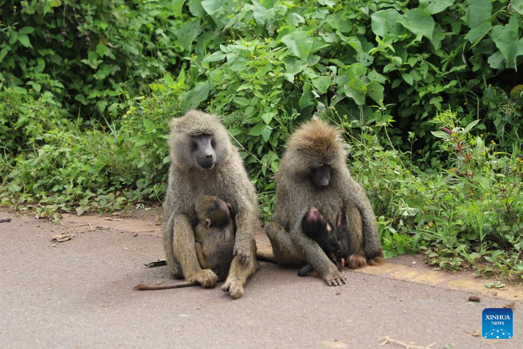 This photo taken on Jan. 29, 2024 shows two baboons feeding their babies in Ngorongoro Conservation Area, Arusha, Tanzania. (Xinhua/Hua Hongli)