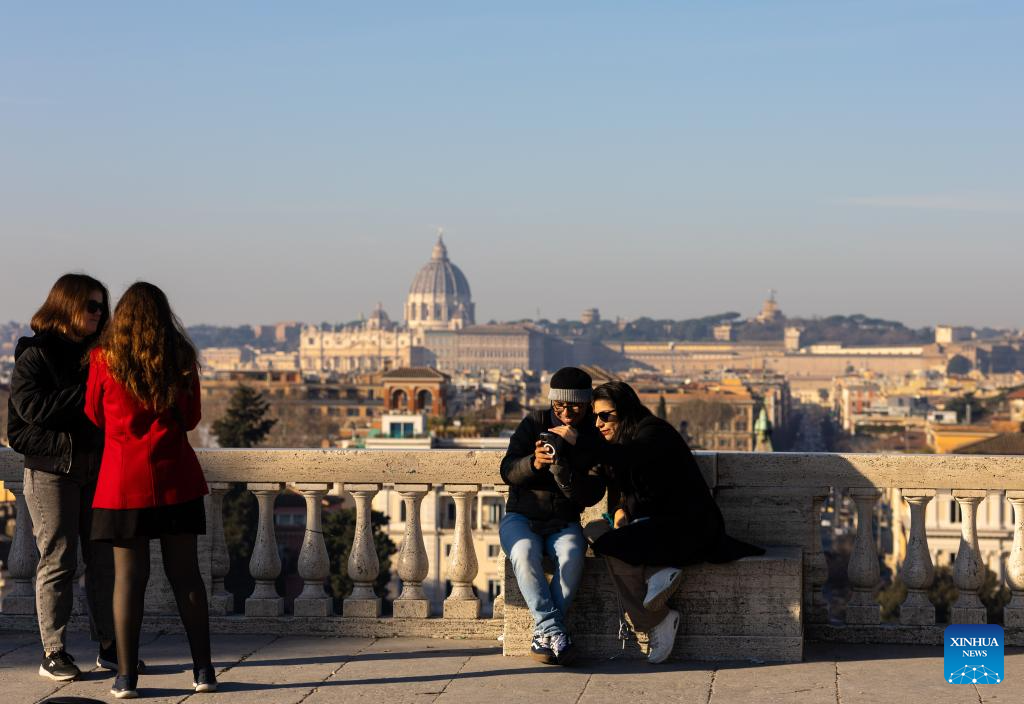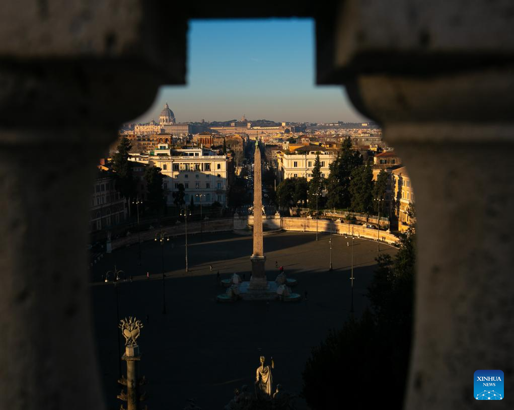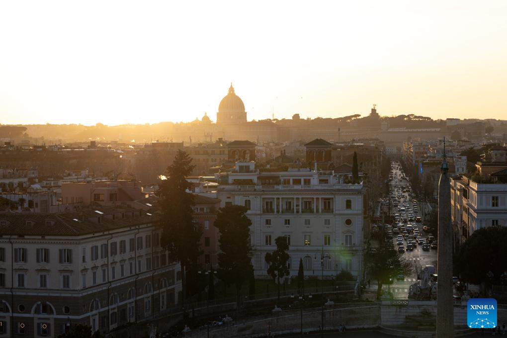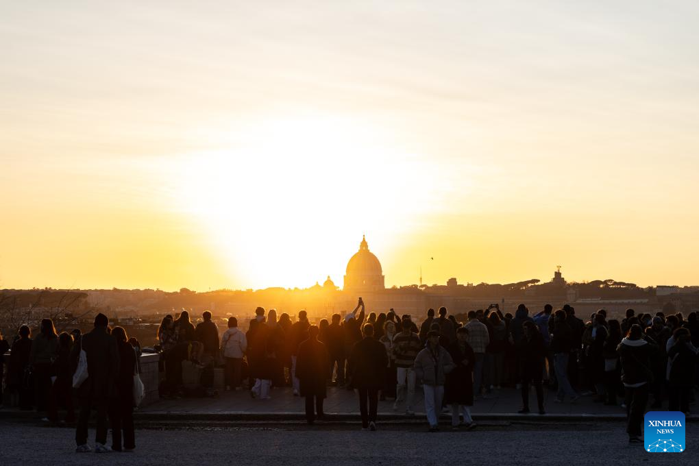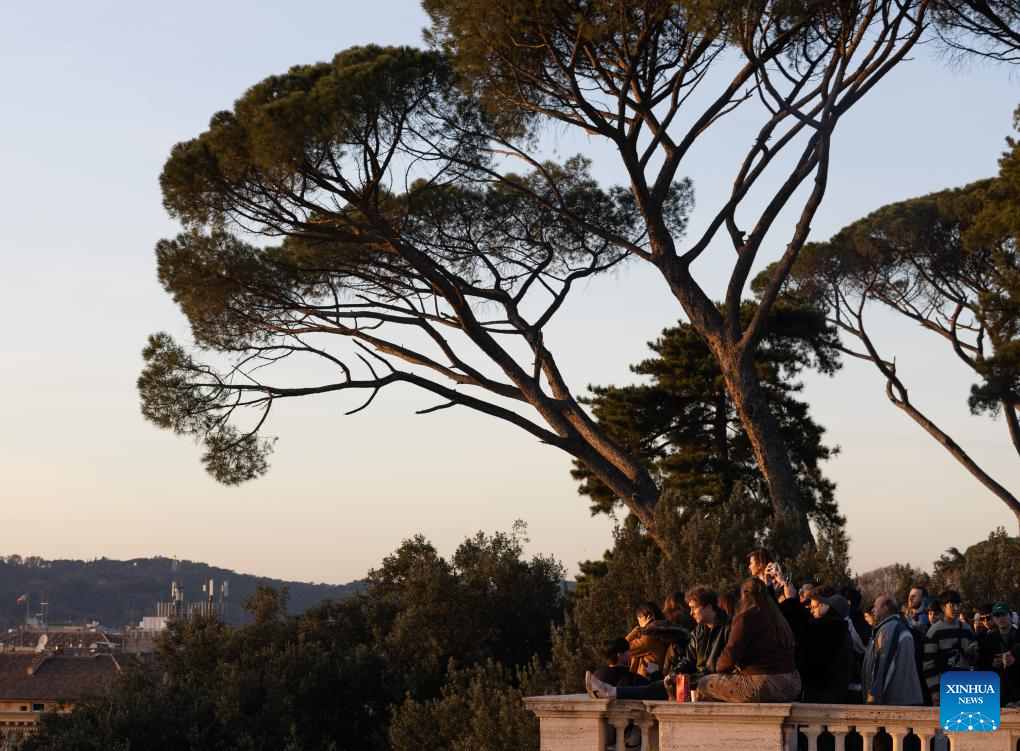 People watch the sunset at Villa Borghese in Rome, Italy, Jan. 23, 2024. (Xinhua/Li Jing)