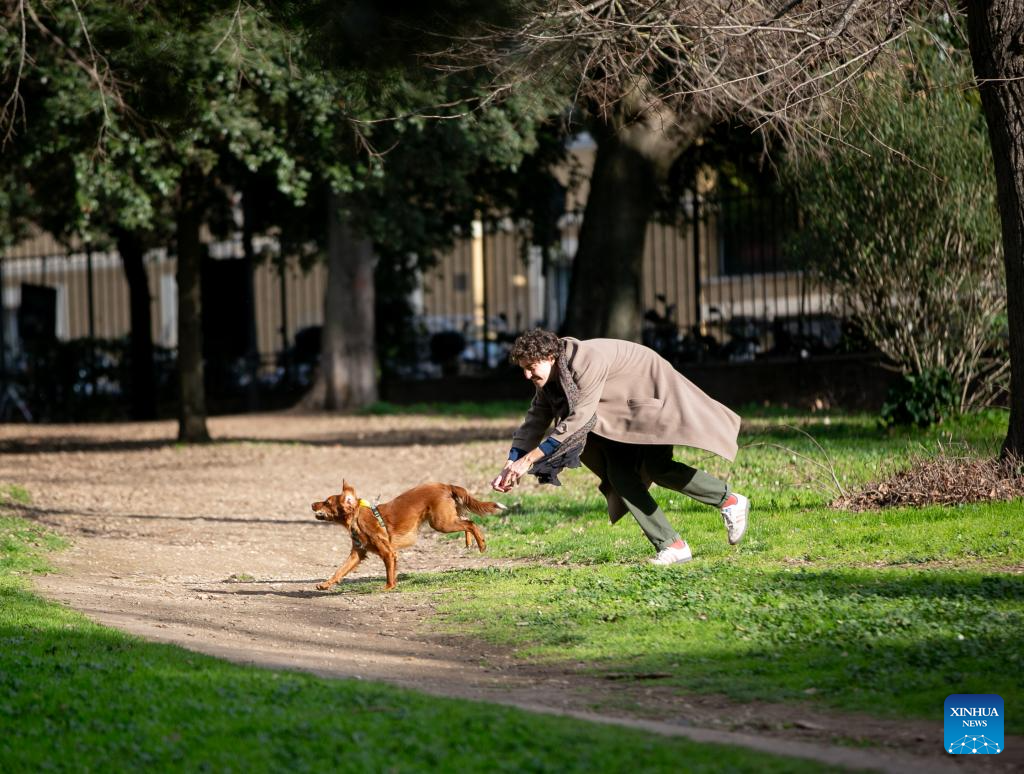 A man entertains with his dog at Villa Borghese in Rome, Italy, Jan. 24, 2024. (Xinhua/Li Jing)