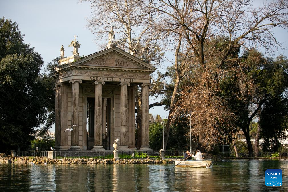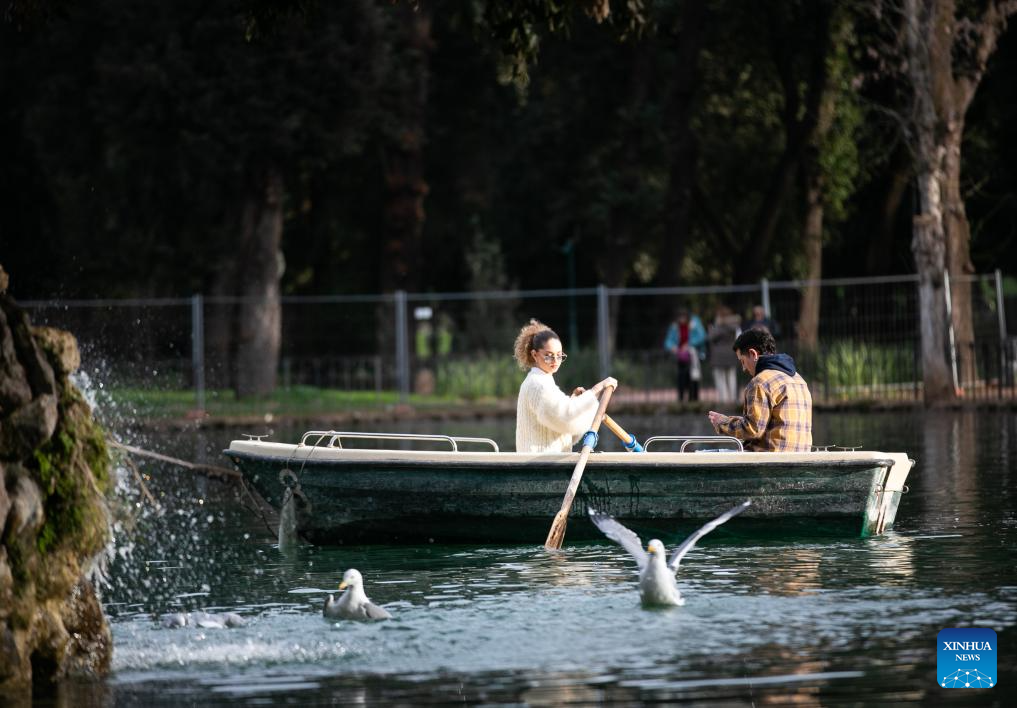 People paddle a boat at Villa Borghese in Rome, Italy, Jan. 24, 2024. (Xinhua/Li Jing)