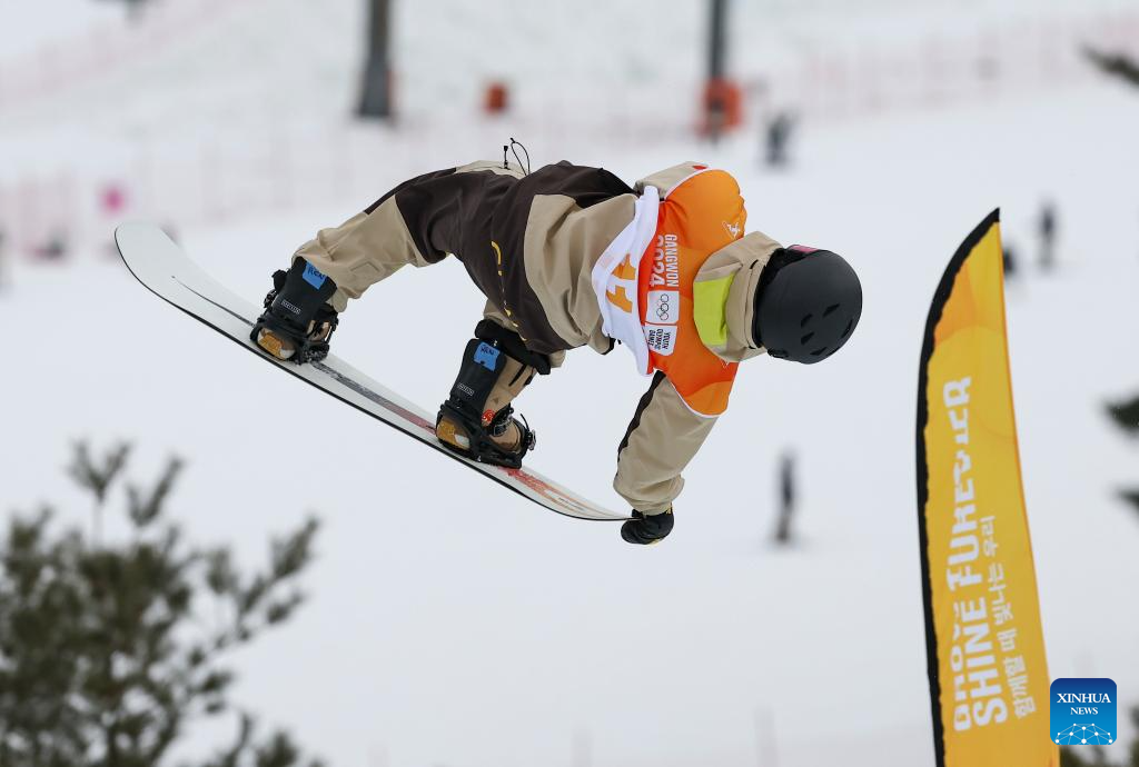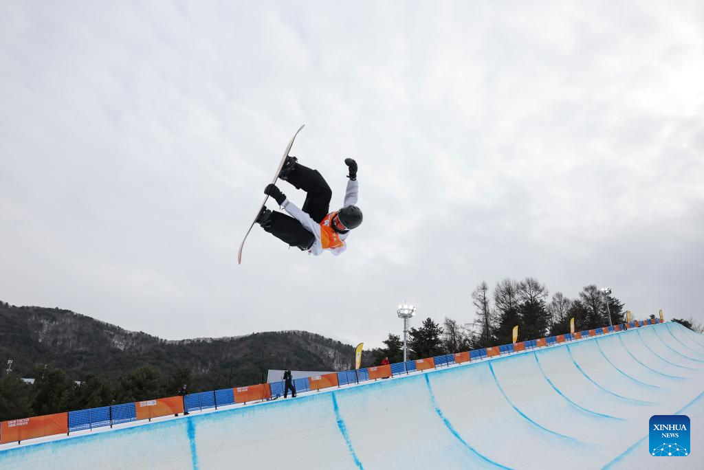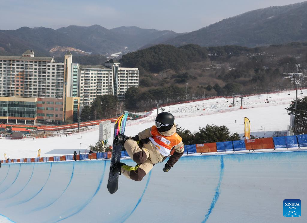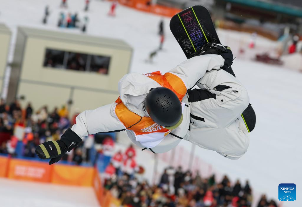 Lee Chaeun of South Korea competes during the Men's Halfpipe Final of snowboard event at the Gangwon 2024 Winter Youth Olympic Games in Hoengseong, South Korea, Feb. 1, 2024. (Xinhua/Hu Huhu)
