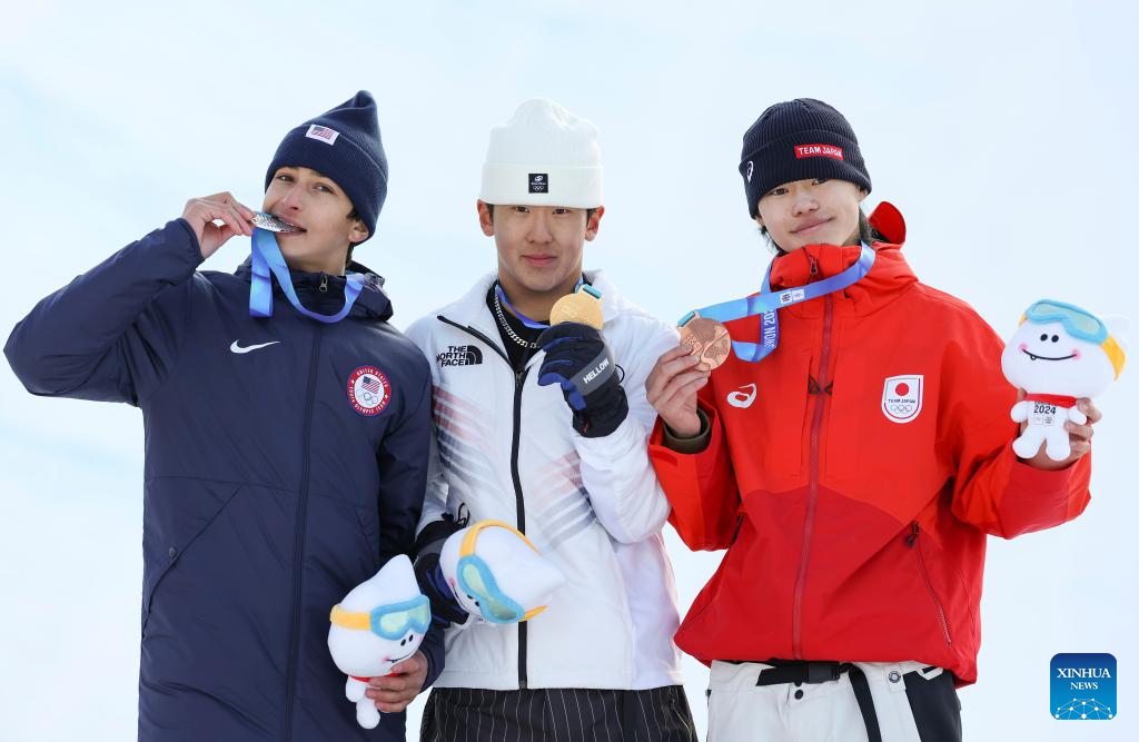 Gold medalist Lee Chaeun (C) of South Korea, silver medalist Alessandro Barbieri (L) of the United States and bronze medalist Yamada Ryusei of Japan pose for photos during the victory ceremony of the Men's Halfpipe Final of snowboard event at the Gangwon 2024 Winter Youth Olympic Games in Hoengseong, South Korea, Feb. 1, 2024. (Xinhua/Hu Huhu)