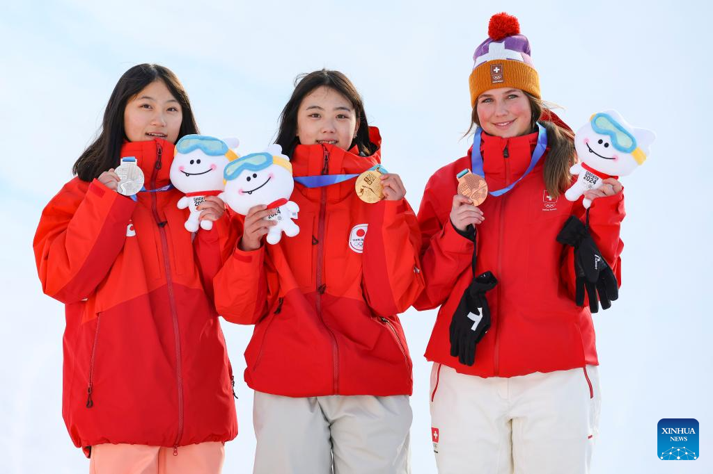 Gold medalist Kudo Rise(C) of Japan, silver medalist Shimizu Sara (L) of Japan and bronze medalist Lura Wick of Switzerland pose for photos during the victory ceremony of the Women's Halfpipe Final of snowboard event at the Gangwon 2024 Winter Youth Olympic Games in Hoengseong, South Korea, Feb. 1, 2024. (Xinhua/Hu Huhu)