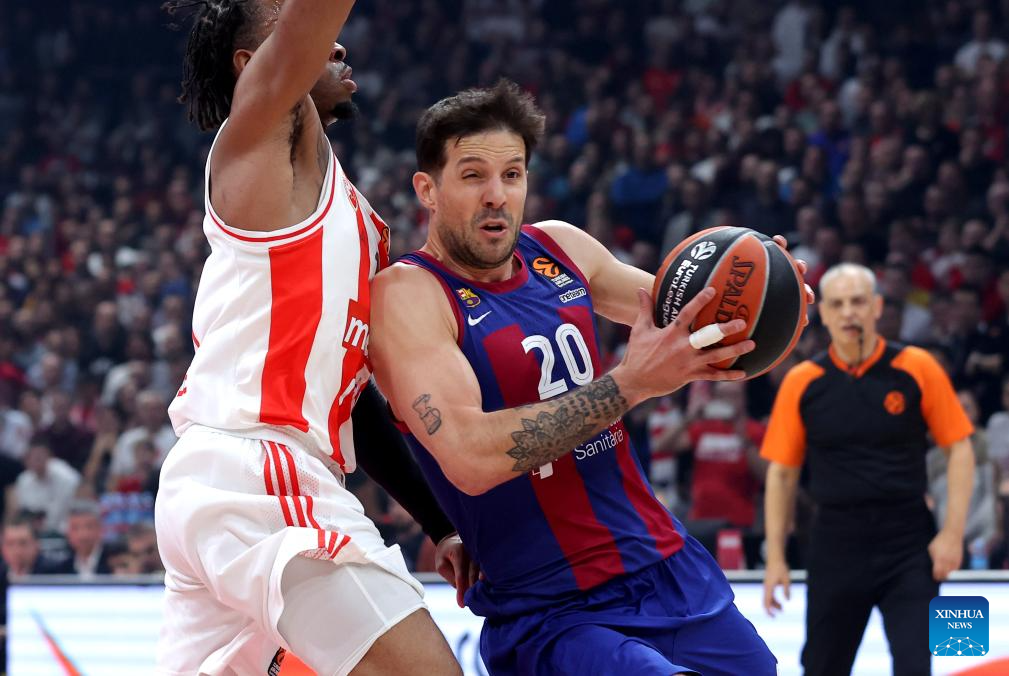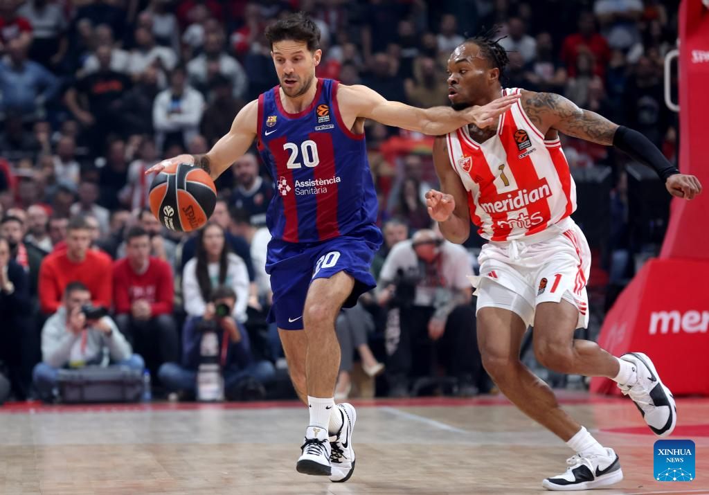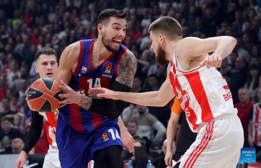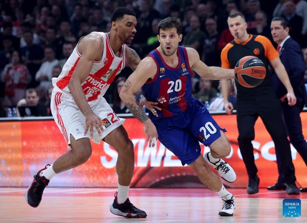 Barcelona's Nicolas Laprovittola (R) vies with Crvena Zvezda's Javonte Smart during the Euroleague round 25 basketball match between Crvena Zvezda (Red Star) and Barcelona in Belgrade, Serbia, on Feb. 2, 2024. (Photo by Predrag Milosavljevic/Xinhua)