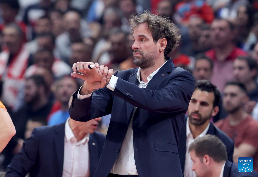 Barcelona's head coach Roger Grimau gestures during the Euroleague round 25 basketball match between Crvena Zvezda (Red Star) and Barcelona in Belgrade, Serbia, on Feb. 2, 2024. (Photo by Predrag Milosavljevic/Xinhua)