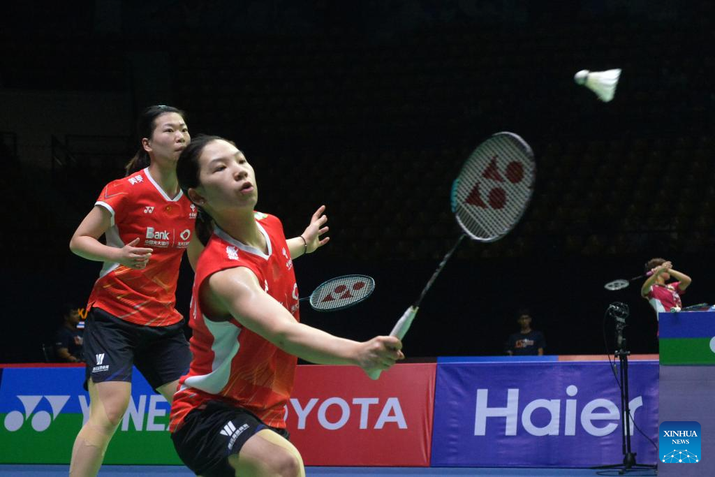 China's He Jiting (L)/Ren Xiangyu compete during the men's doubles semifinal against Indonesia's Muhammad Shohibul Fikri/Bagas Maulana at the Thailand Masters 2024 badminton tournament in Bangkok, Thailand, Feb. 3, 2024. (Xinhua/Rachen Sageamsak)