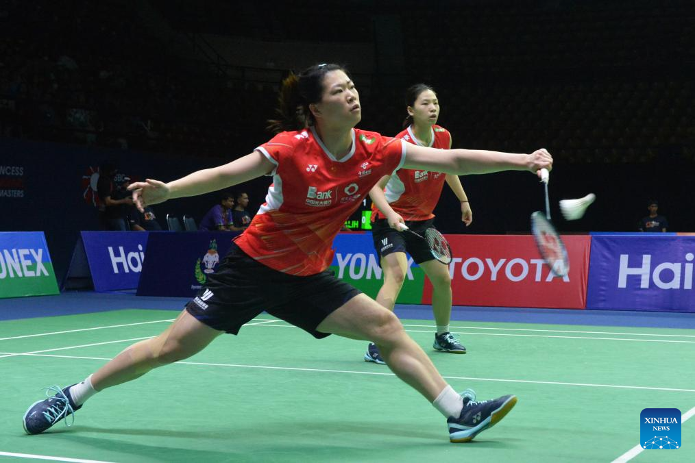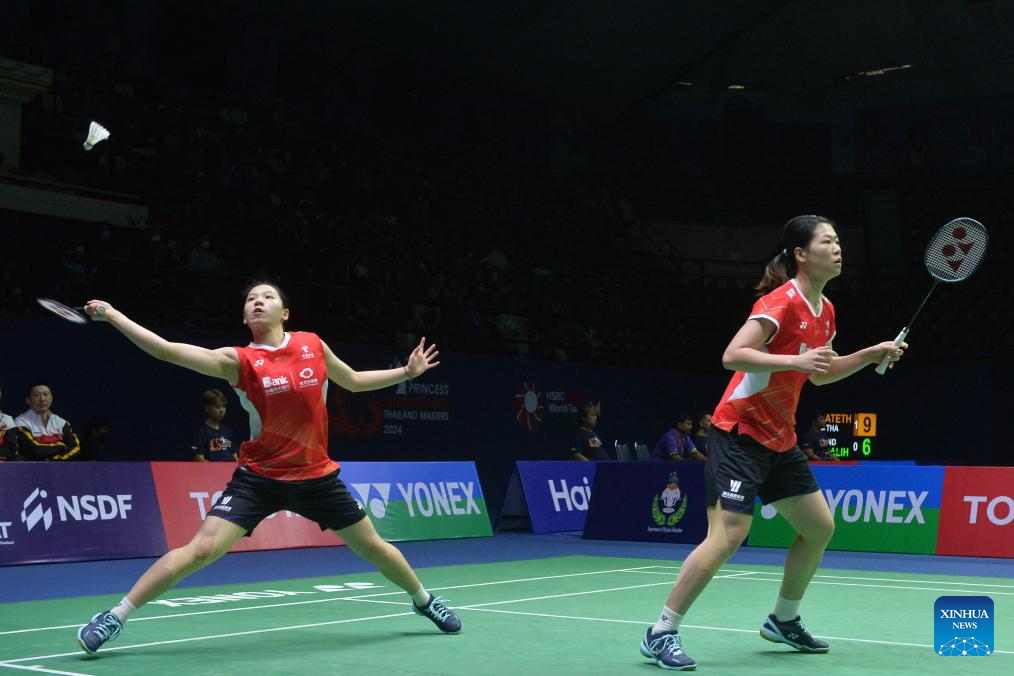 China's Li Yijing (R)/Luo Xumin compete against South Korea's Lee Yu Lim/Shin Seung Chan during the women's doubles semifinal at the Thailand Masters 2024 badminton tournament in Bangkok, Thailand, Feb. 3, 2024. (Xinhua/Rachen Sageamsak)