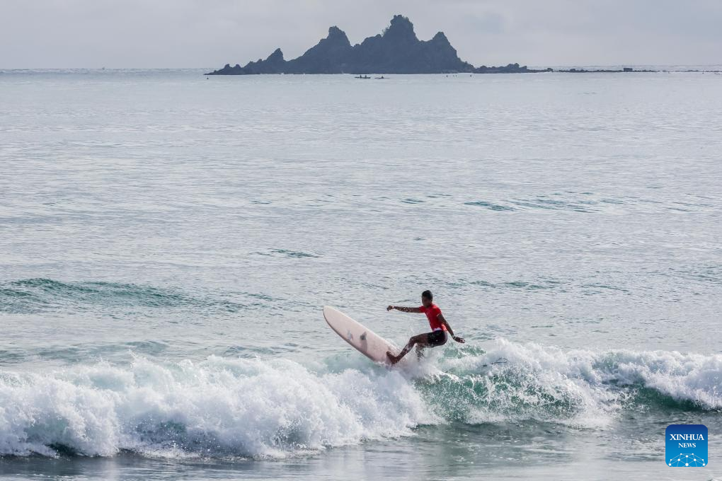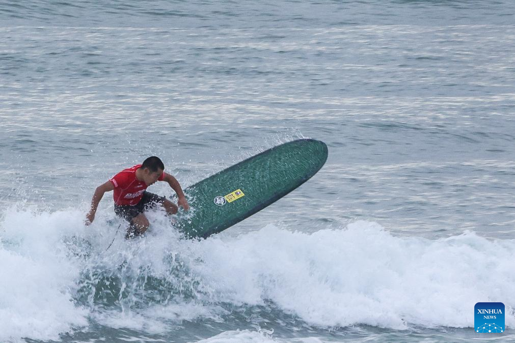Rico Dumaguin of the Philippines competes during the Longboard Qualifying Series 3000 at World Surf League Baler International Pro in Aurora Province, the Philippines, on Feb. 3, 2024. (Xinhua/Rouelle Umali)