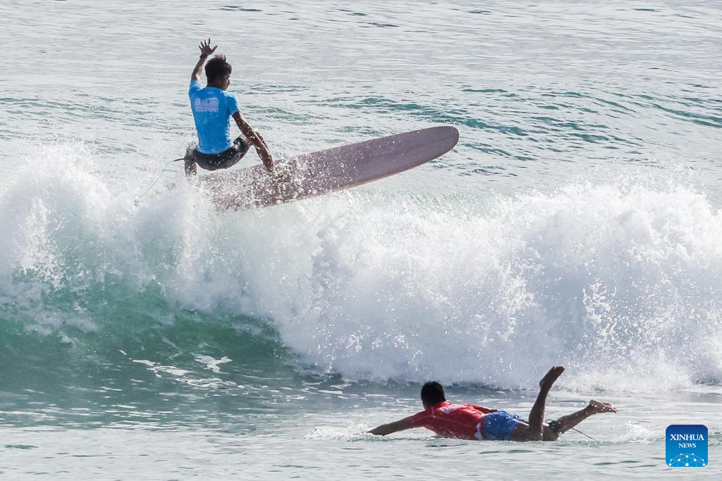 Mark Serjay Aguila (R) and Justin Ebueza of the Philippines compete during the Longboard Qualifying Series 3000 at World Surf League Baler International Pro in Aurora Province, the Philippines, on Feb. 3, 2024. (Xinhua/Rouelle Umali)