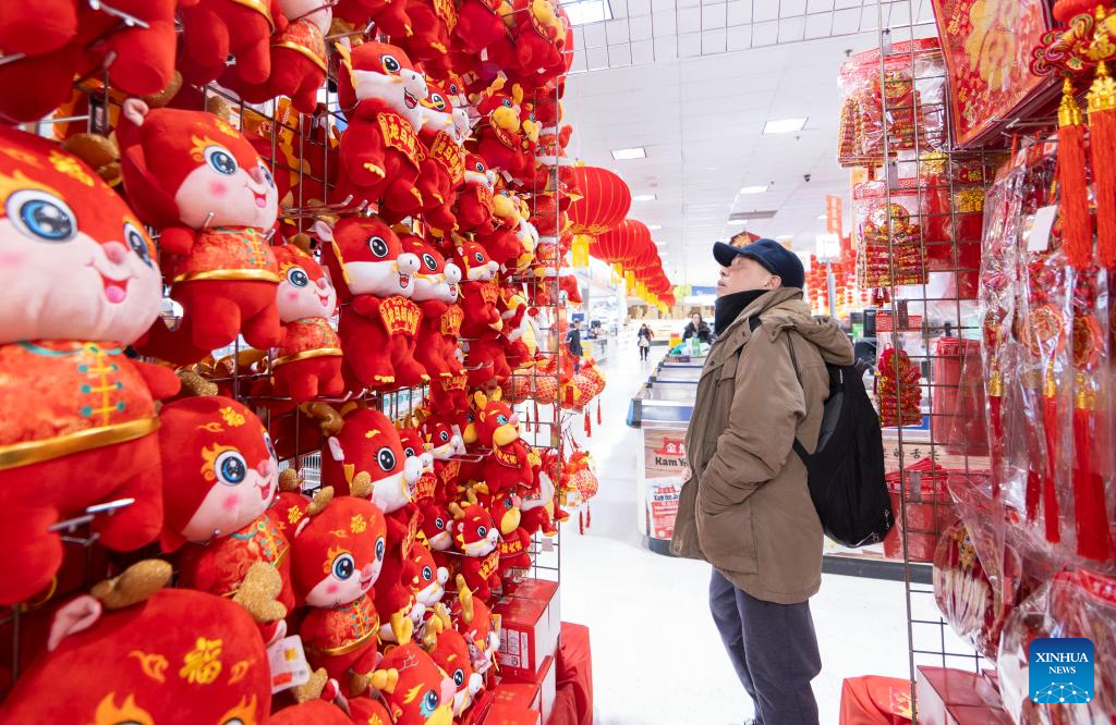 A man shops at a supermarket with decorations marking the upcoming Chinese Lunar New Year of the Dragon in Toronto, Canada, on Feb. 2, 2024. Many shopping malls and supermarkets here have put up themed decorations to celebrate the upcoming Chinese Lunar New Year of the Dragon. (Photo by Zou Zheng/Xinhua)