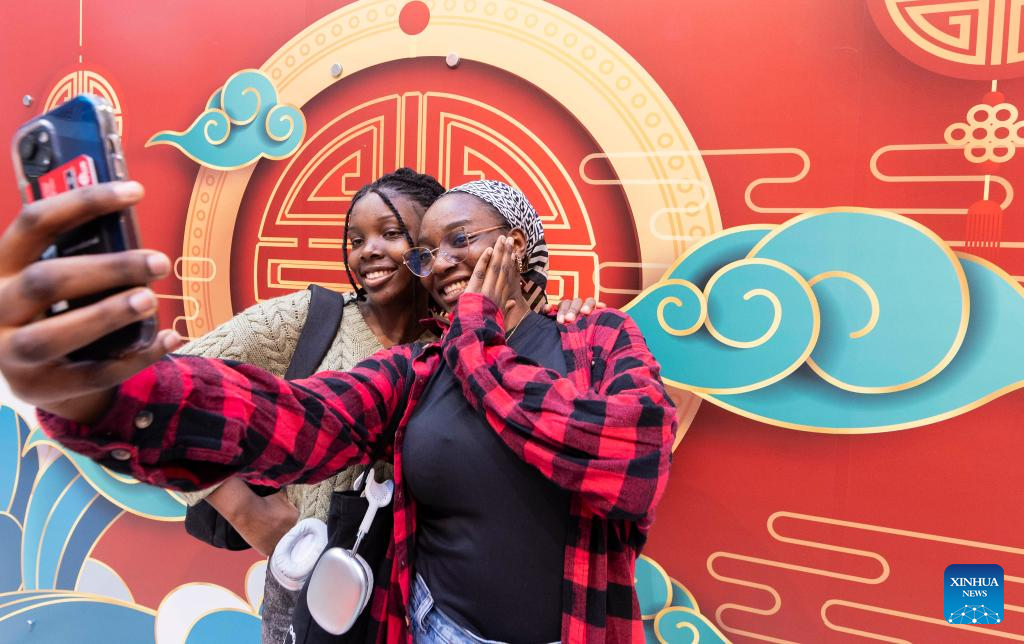 People take a selfie with a Chinese Lunar New Year decoration at a shopping center in Toronto, Canada, on Feb. 2, 2024. Many shopping malls and supermarkets here have put up themed decorations to celebrate the upcoming Chinese Lunar New Year of the Dragon. (Photo by Zou Zheng/Xinhua)