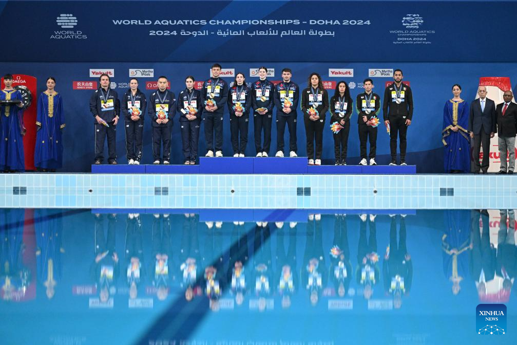 Gold medalist Team Britain (C), silver medalist Team Mexico (R) and bronze medalist Team Australia pose on the podium during the medal ceremony of the mixed 3m & 10m team of diving at the World Aquatics Championships 2024 in Doha, Qatar, Feb. 2, 2024. (Xinhua/Xue Yuge)