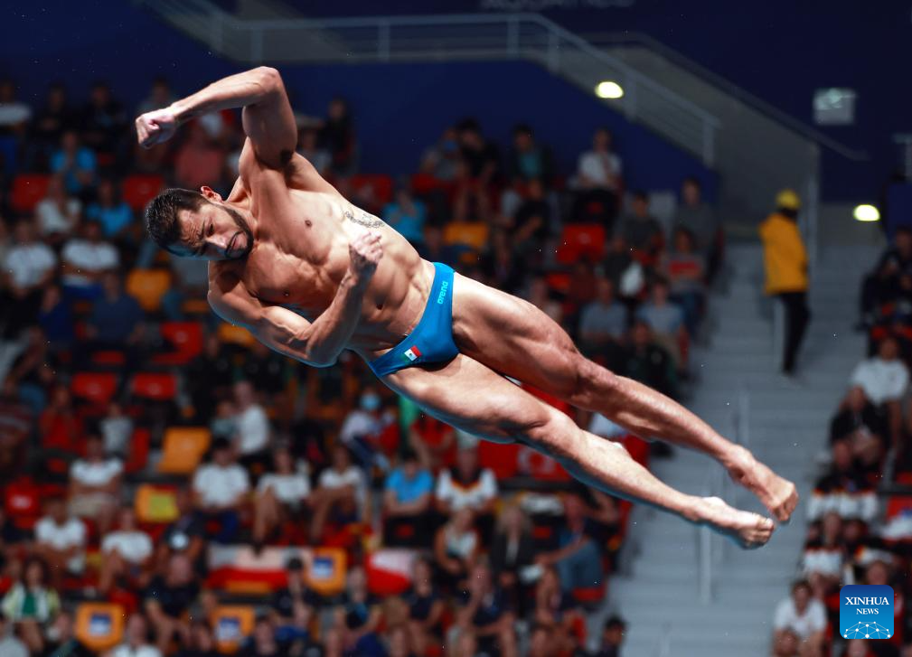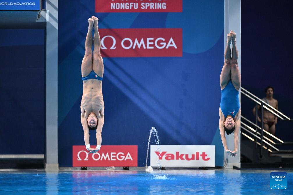 Eduard Cristian Timbretti Gugiu of Team Italy competes during the mixed 3m & 10m team final of diving at the World Aquatics Championships 2024 in Doha, Qatar, Feb. 2, 2024. (Xinhua/Luo Yuan)