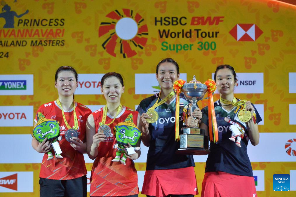 Silver medalists China's Li Yijing (2nd L)/Luo Xumin (1st L) and gold medalists Thailand's Benyapa Aimsaard (2nd R)/Nuntakarn Aimsaard pose during the awarding ceremony for the women's doubles event at the Thailand Masters 2024 badminton tournament in Bangkok, Thailand, Feb. 4, 2024. (Xinhua/Rachen Sageamsak)