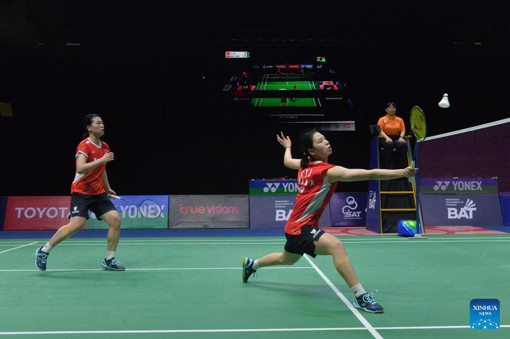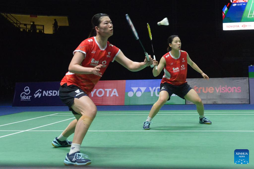 China's Li Yijing/Luo Xumin (L) compete against Thailand's Benyapa Aimsaard/Nuntakarn Aimsaard during the women's doubles final at the Thailand Masters 2024 badminton tournament in Bangkok, Thailand, Feb. 4, 2024. (Xinhua/Rachen Sageamsak)