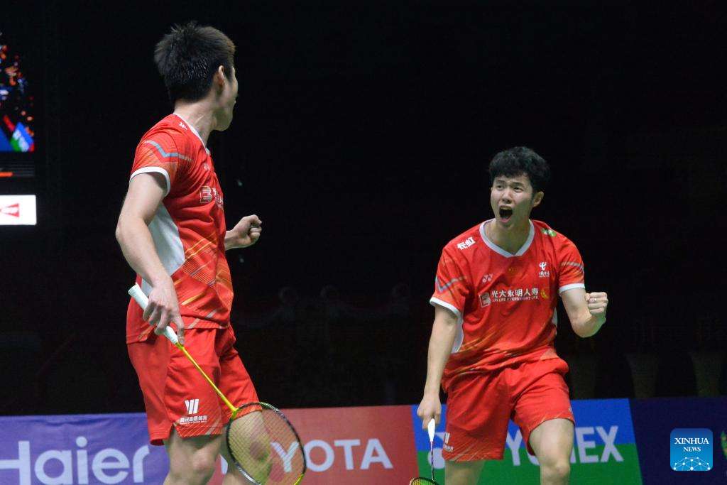 China's He Jiting/Ren Xiangyu (L) celebrate during the men's doubles final against Thailand's Peeratchal Sukphun/Pakkapon Teeraratsakul at the Thailand Masters 2024 badminton tournament in Bangkok, Thailand, Feb. 4, 2024. (Xinhua/Rachen Sageamsak)