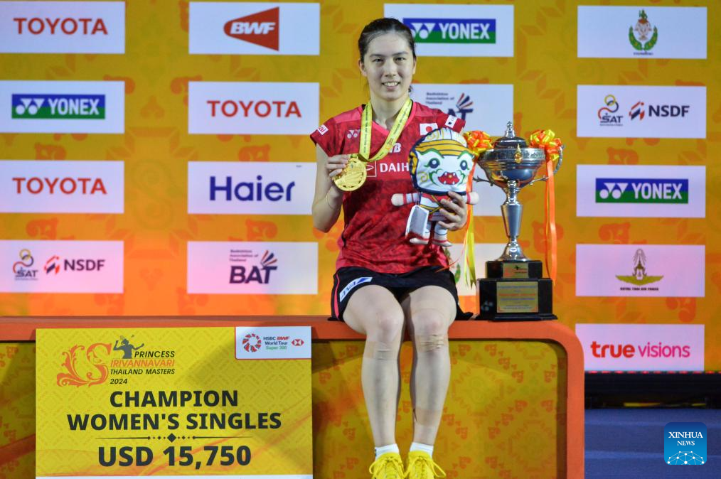 Ohori Aya of Japan shows her gold medal after the women's singles final match against Supanida Katethong of Thailand at the Thailand Masters 2024 badminton tournament in Bangkok, Thailand, Feb. 4, 2024. (Xinhua/Rachen Sageamsak)