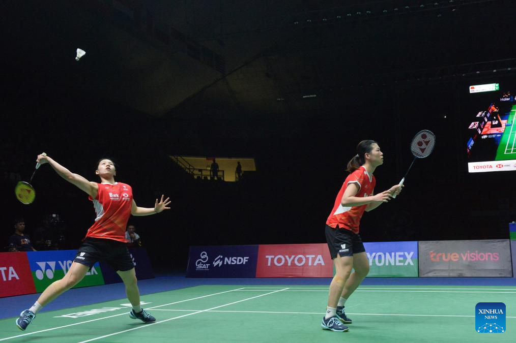 China's Li Yijing (L)/Luo Xumin compete against Thailand's Benyapa Aimsaard/Nuntakarn Aimsaard during the women's doubles final at the Thailand Masters 2024 badminton tournament in Bangkok, Thailand, Feb. 4, 2024. (Xinhua/Rachen Sageamsak)