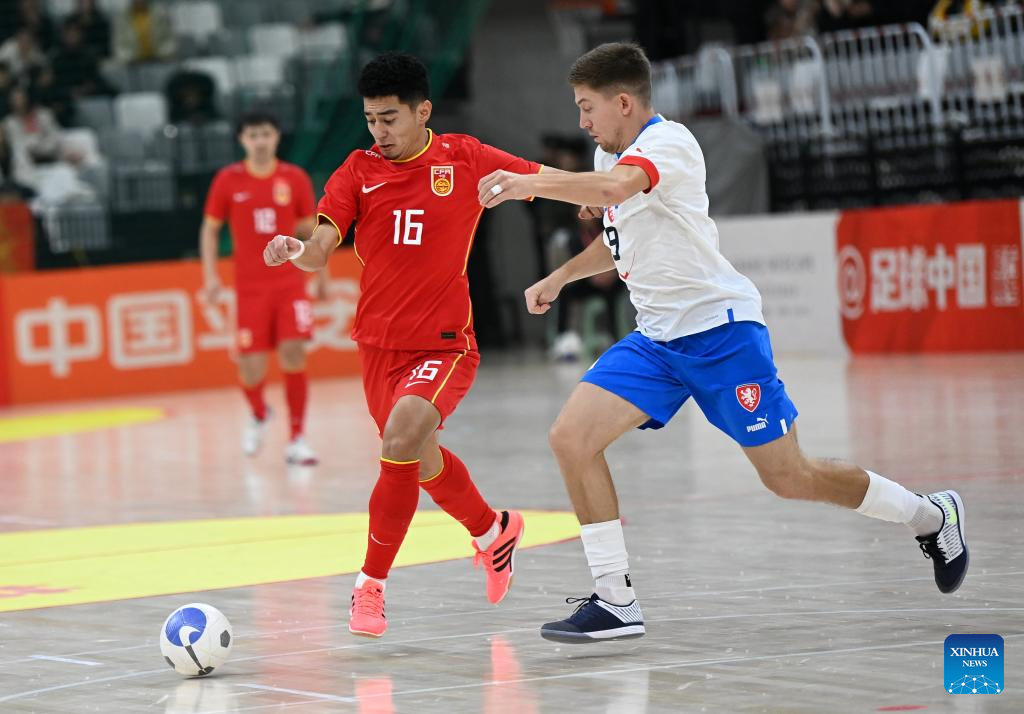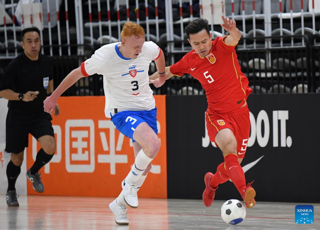 Kai Saier (R) of China vies with Tomas Kuchta of the Czech Republic during a match at the CFA "Yulin Tourism Investment" Cup Futsal International Tournament 2024 in Yulin, northwest China's Shaanxi Province, Feb. 4, 2024. (Xinhua/Li Yibo)