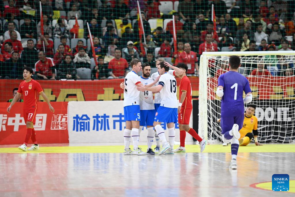 Players of the Czech Republic celebrate a goal during a match between China and the Czech Republic at the CFA "Yulin Tourism Investment" Cup Futsal International Tournament 2024 in Yulin, northwest China's Shaanxi Province, Feb. 4, 2024. (Xinhua/Li Yibo)