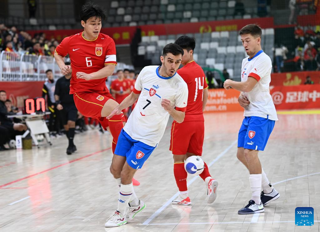 Xu Yang (1st L) of China shoots past Francisco Mikus (2nd L) of the Czech Republic during a match at the CFA "Yulin Tourism Investment" Cup Futsal International Tournament 2024 in Yulin, northwest China's Shaanxi Province, Feb. 4, 2024. (Xinhua/Li Yibo)