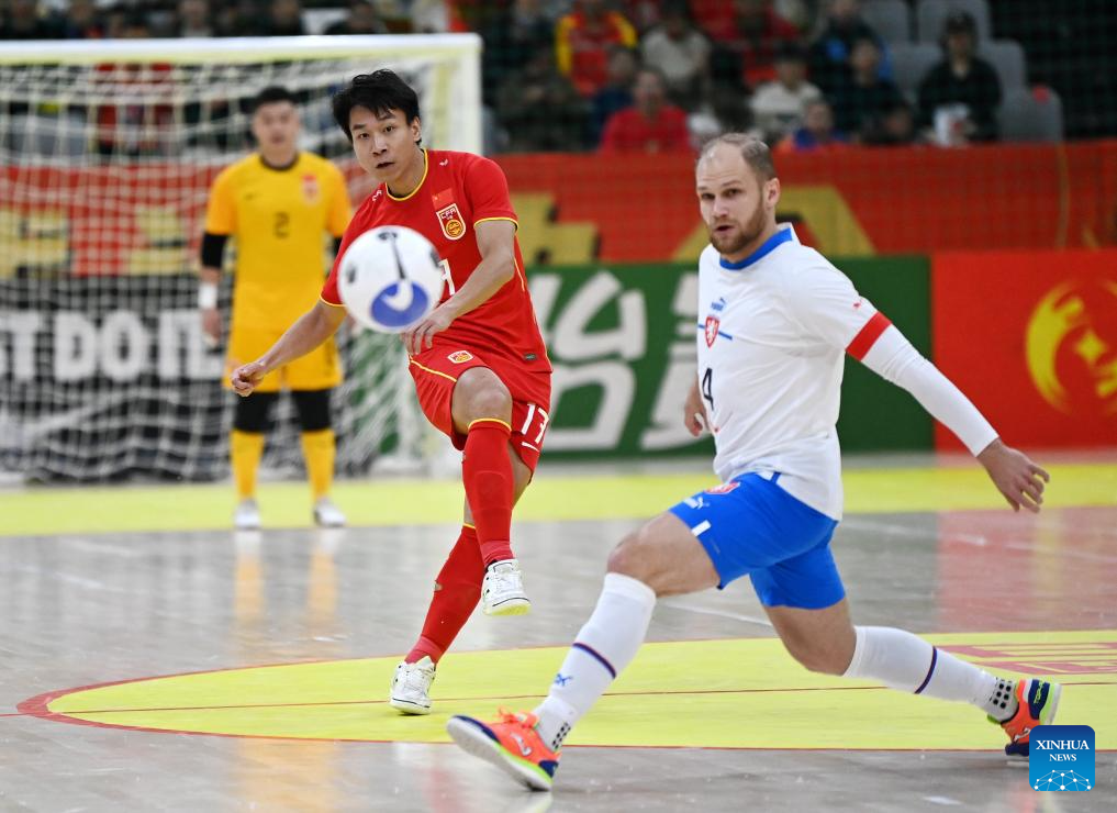 David Drozd (R) of the Czech Republic shoots to score during a match between China and the Czech Republic at the CFA "Yulin Tourism Investment" Cup Futsal International Tournament 2024 in Yulin, northwest China's Shaanxi Province, Feb. 4, 2024. (Xinhua/Li Yibo)