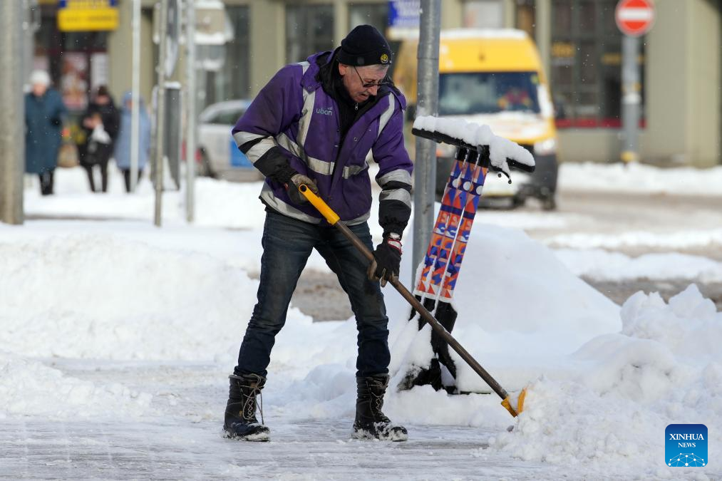 A man clear snow from the sidewalk in Riga, Latvia, Feb. 8, 2024. The Latvian capital city of Riga was hit by 16 centimeters of snow on Thursday. (Photo by Edijs Palens/Xinhua)