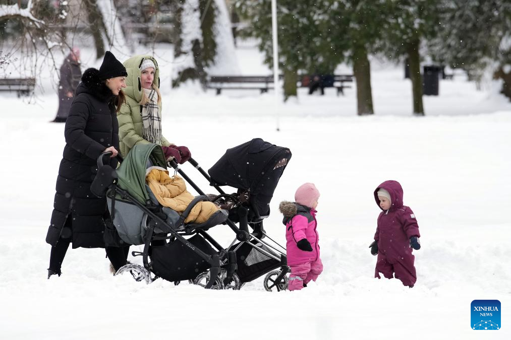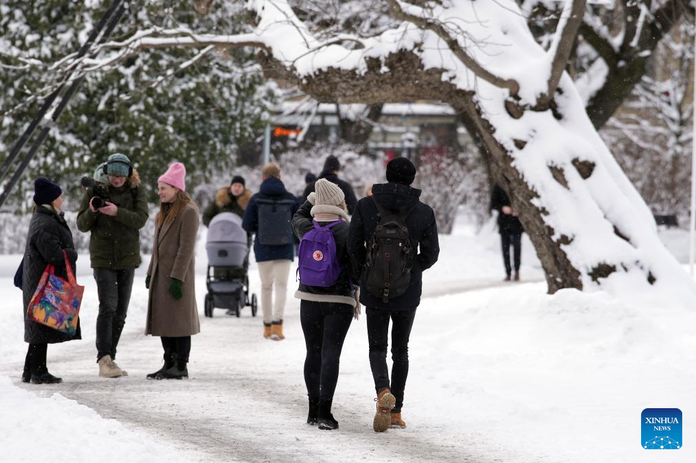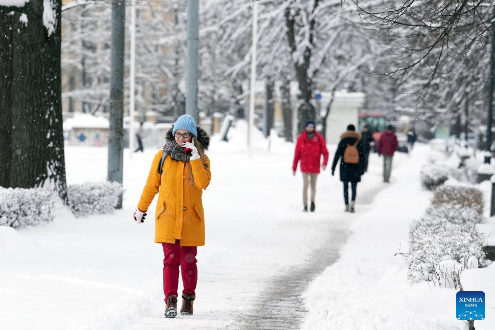 People walk on a snow-covered road in Riga, Latvia, Feb. 8, 2024. The Latvian capital city of Riga was hit by 16 centimeters of snow on Thursday. (Photo by Edijs Palens/Xinhua)