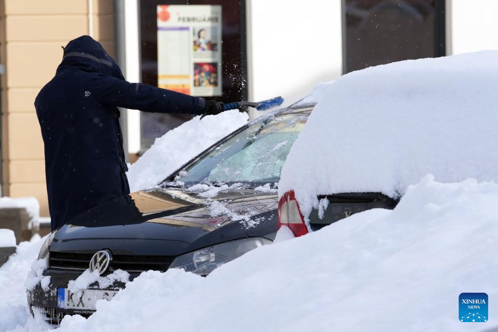 A man clear snow from a car in Riga, Latvia, Feb. 8, 2024. The Latvian capital city of Riga was hit by 16 centimeters of snow on Thursday. (Photo by Edijs Palens/Xinhua)