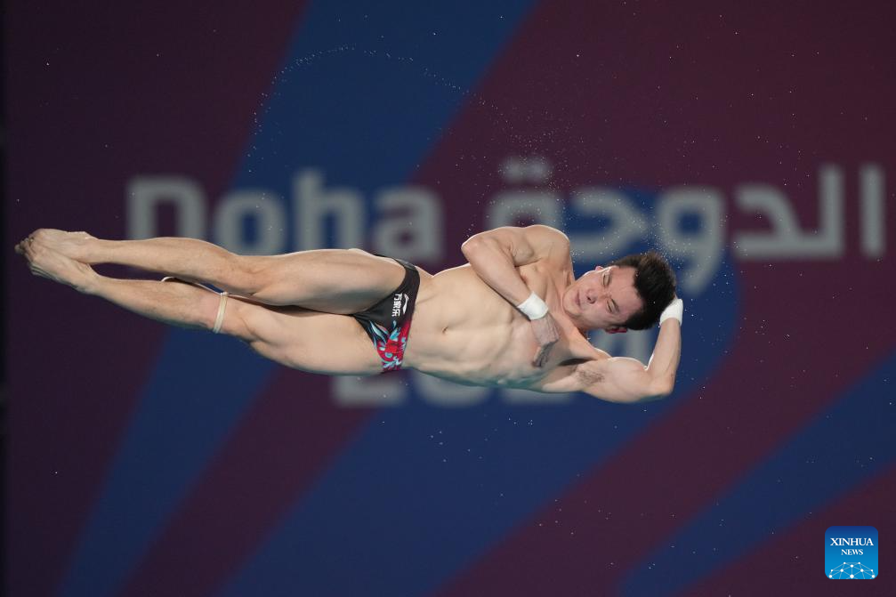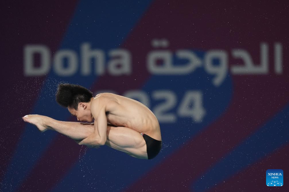 Yang Hao of China competes during the men's 10m platform final of the World Aquatics Championships 2024 in Doha, Qatar on Feb. 10, 2024. (Xinhua/Xue Yuge)