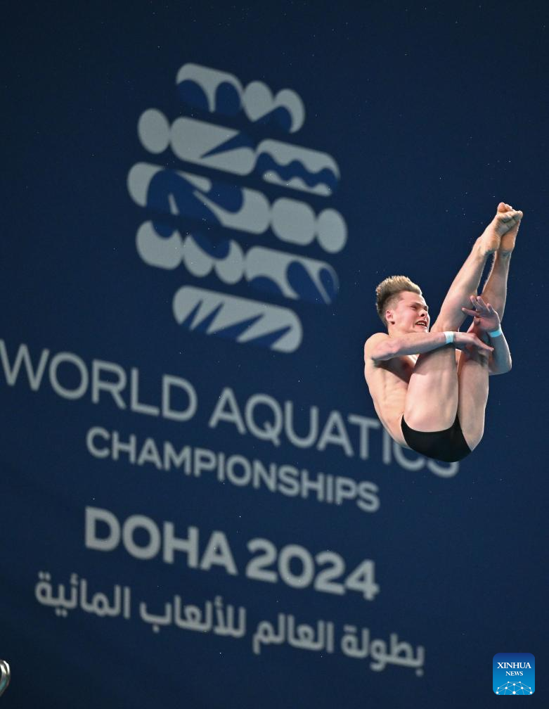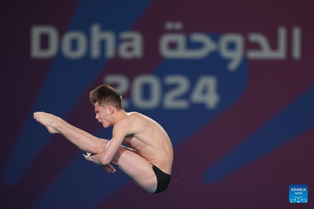 Oleksii Sereda of Ukraine competes during the men's 10m platform final of the World Aquatics Championships 2024 in Doha, Qatar on Feb. 10, 2024. (Xinhua/Xue Yuge)