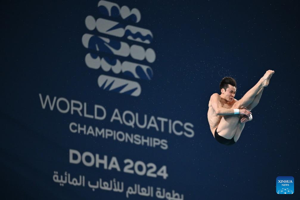 Cao Yuan of China competes during the men's 10m platform final of the World Aquatics Championships 2024 in Doha, Qatar on Feb. 10, 2024. (Xinhua/Xue Yuge)