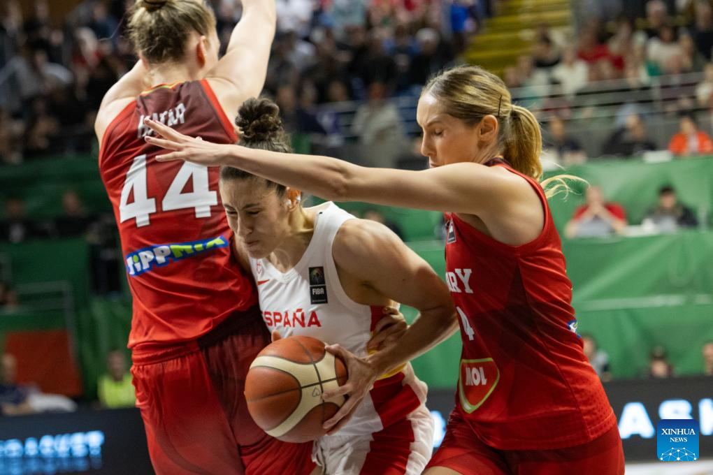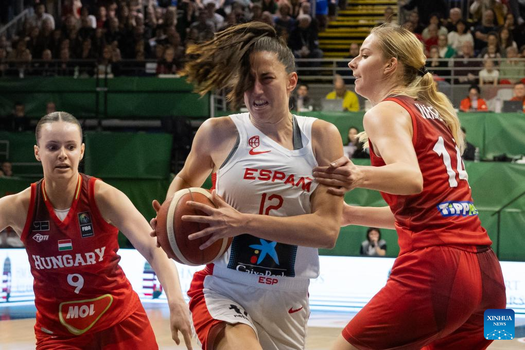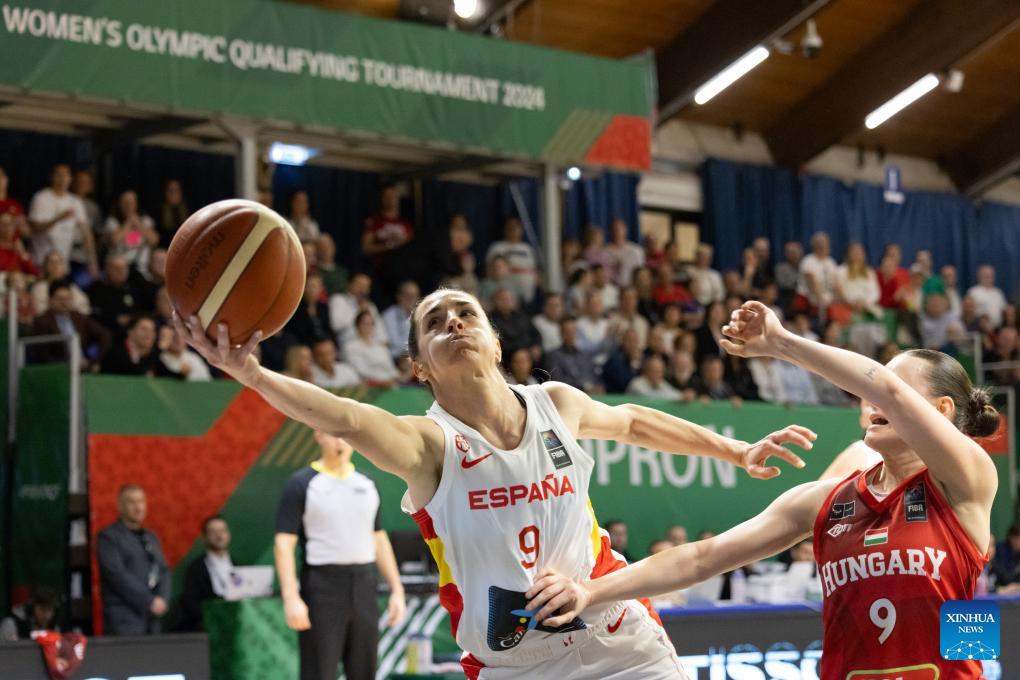 Maite Cazorla (C) of Spain breaks though during the match between Spain and Hungary at the FIBA Women's Olympic qualifying tournament in Sopron, Hungary on Feb. 11, 2024. (Photo by Attila Volgyi/Xinhua)